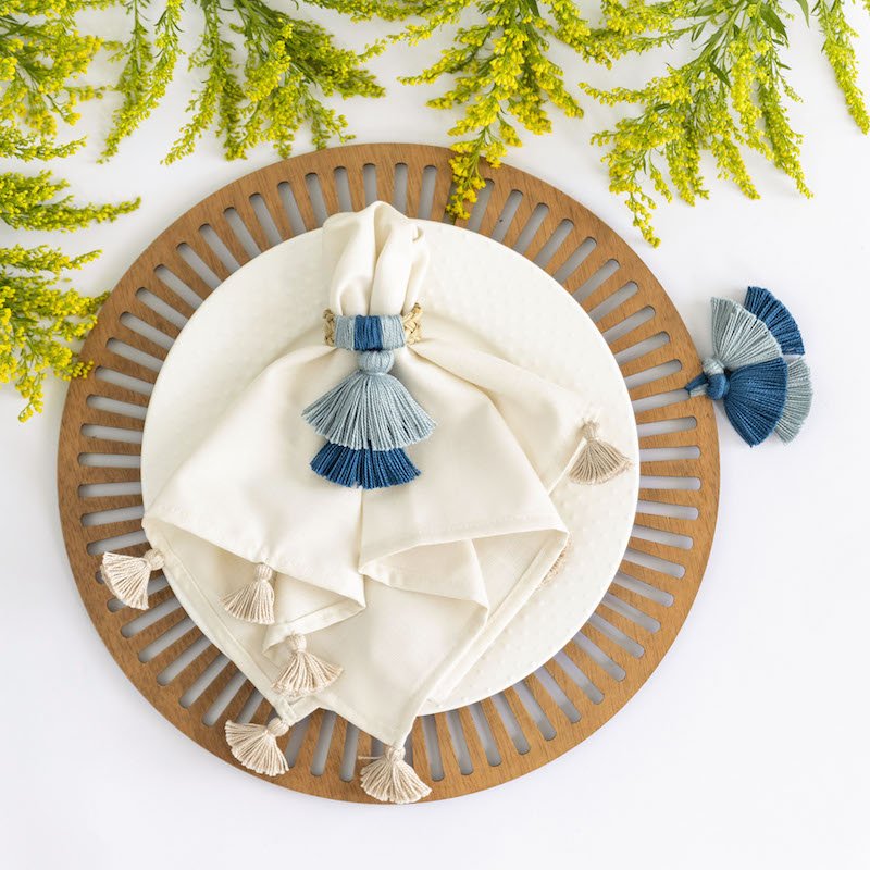 Set de 4 aros de servilleta con borlas, tejidos a mano.