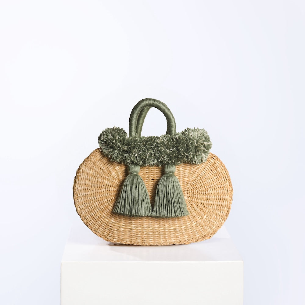 Materiales: Tejido de bolso seagrass - Pompones y borlas en hilo de algodón.